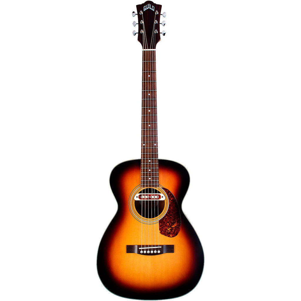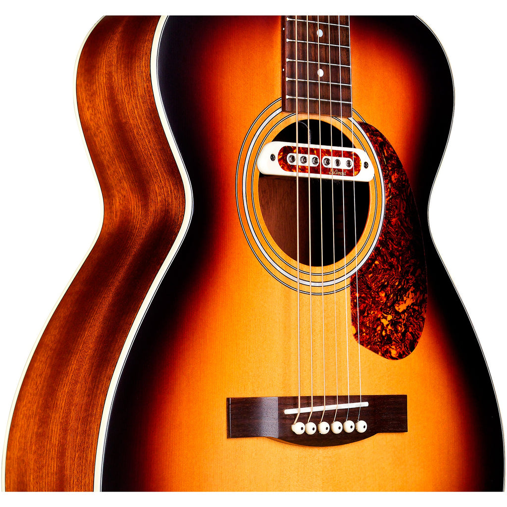 Guild's heritage as one of America's premier early guitar makers is acknowledged in the M-240E. Solid Sitka spruce and mahogany meet in a compact concert body with an arched back for a big sound and great playing experience. A real bone nut and saddle deliver golden-era sustain and clarity. And a 1960s red tortoiseshell pickguard gives this guitar a look that was made to be seen.