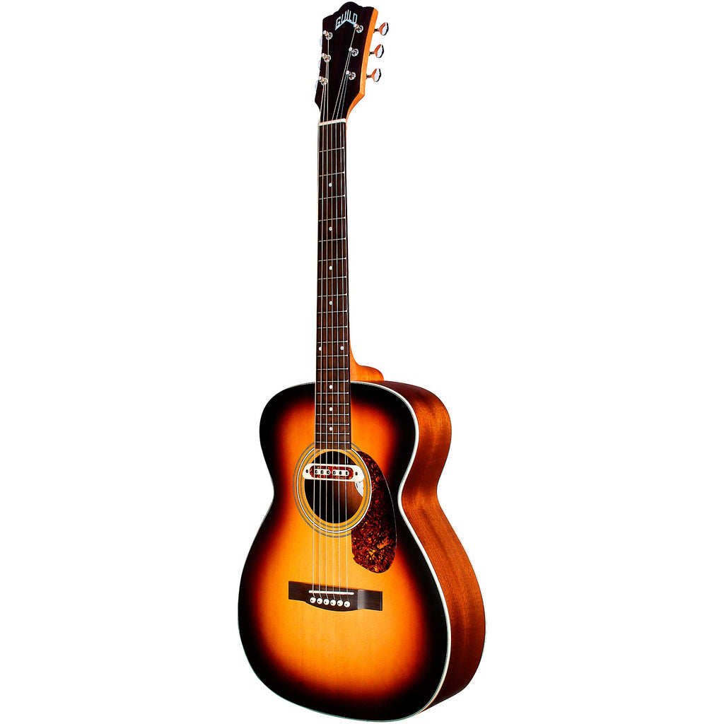 Music Experience guitarists love small-bodied acoustics for home recording and playing around the house. The concert-sized Guild M-240E is no exception. This diminutive guitar plays great and knows how to cut through a mix. Its classic mahogany/spruce construction produces a warm, natural tone with complex overtones and surprising projection that can fill a room with music.