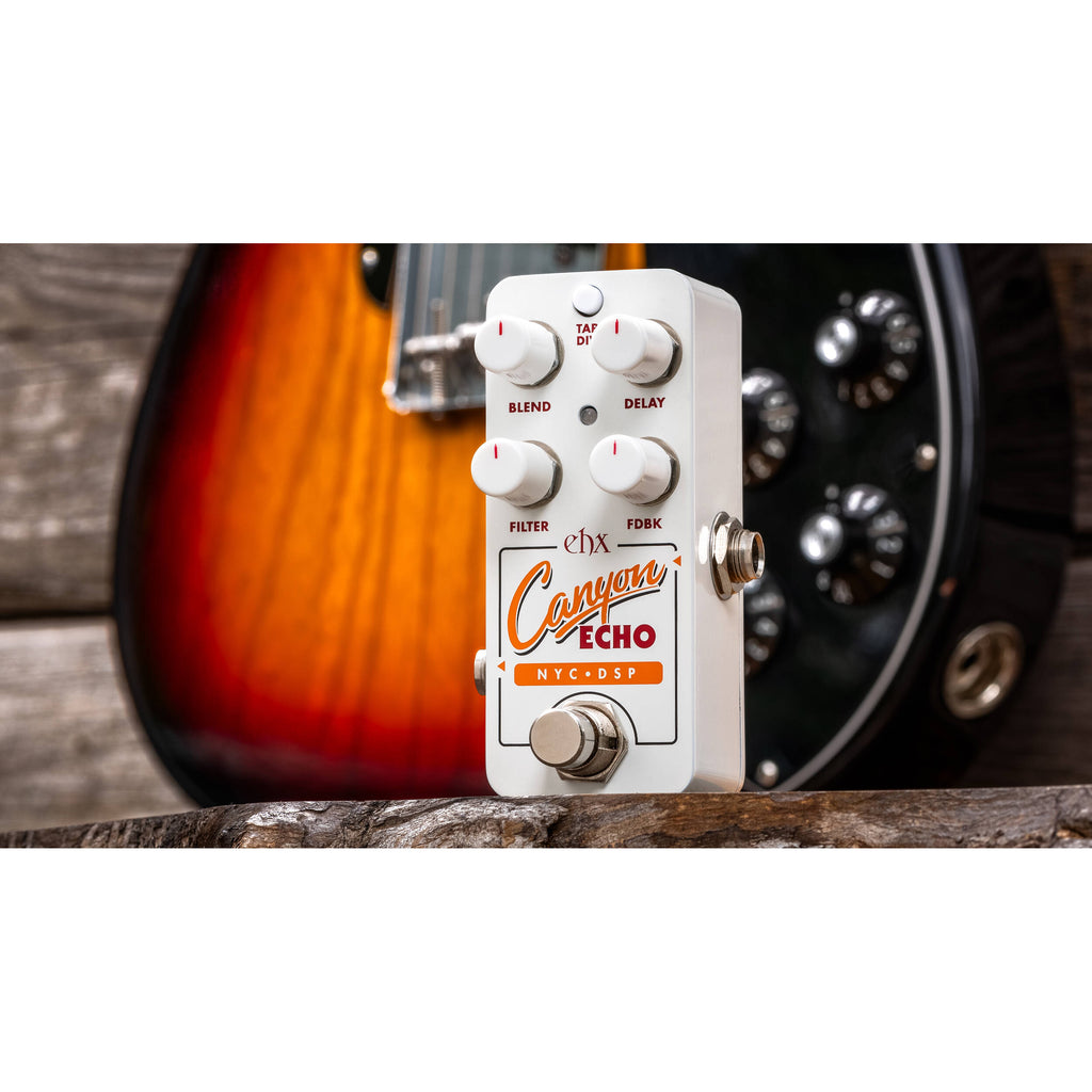 The EHX Pico Canyon Echo takes the digital delay from the award-winning Canyon Delay and Looper and plates it up as a single serving echo unit. Starting with a crystal clean delay, the Canyon Echo is a sweetly simple delay with 3 seconds of delay time. Don’t let the size fool you, this canyon is deep! Add filtering, tap tempo, and a feedback knob capable of infinite repeats and this little echo is up to most time bending tasks. The Canyon Echo features a BLEND knob to get the perfect wet/dry mix. The DELAY knob sets the delay time from 8ms to 3s. FEEDBACK is adjustable from 1 repeat to infinite repeats for endless delay washes and pads. Turn the FILTER knob past noon and it’s a High Pass Filter while below noon it is a Low Pass Filter. Tap Tempo is simple and easy to use. Just press and release the footswitch at least two times to set the tempo and the LED will blink to confirm your tap tempo. The tempo can then be subdivided from a quarter note to a dotted eight note to an eighth note with the TAP DIV button. Additionally, the Canyon Echo also features selectable Tails bypass so echoes continue after putting the pedal into bypass. The Canyon Echo also features a new style of Infinite Repeats where a single delay is repeated and the input is taken out of the delay path. This makes the pedal function like a micro tape looper that can be played over without new delays being created. The micro loop can also be manipulated into warped sound effects by adjusting the DELAY knobs.