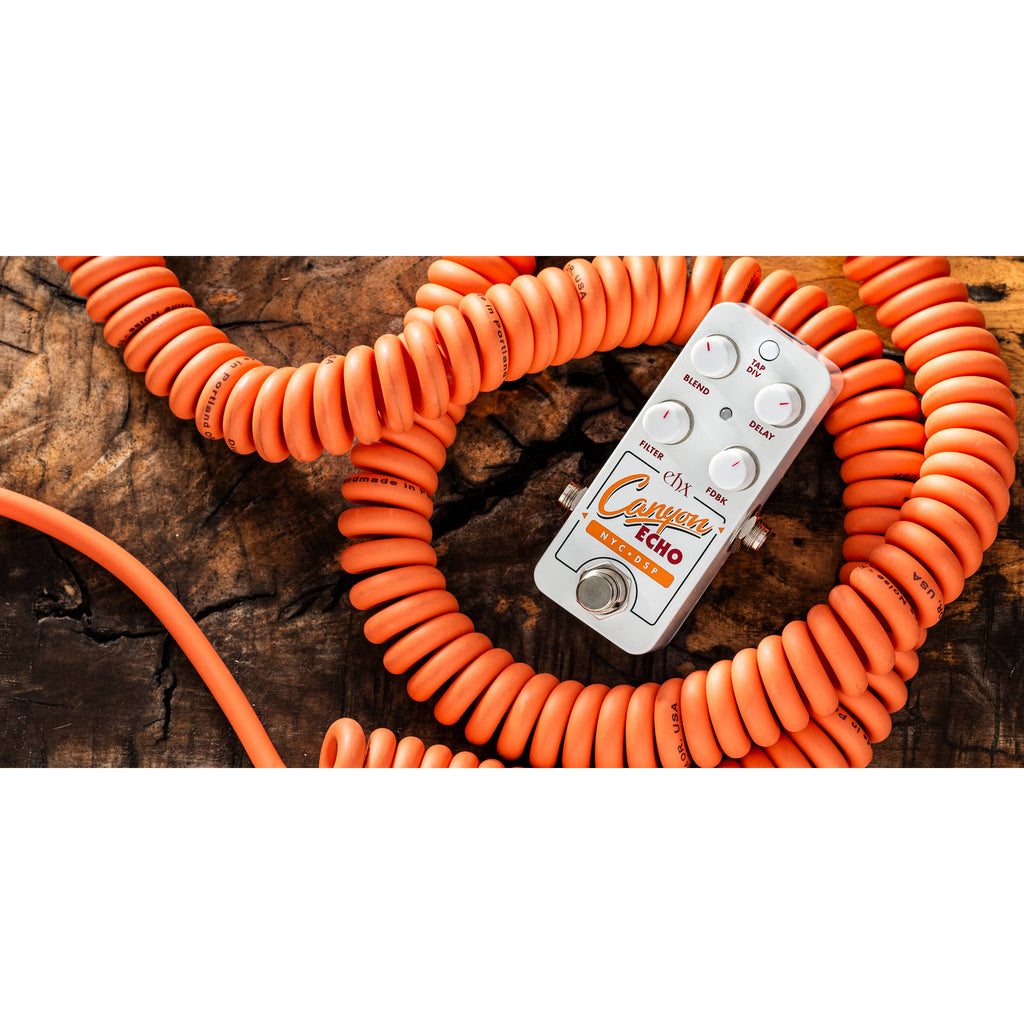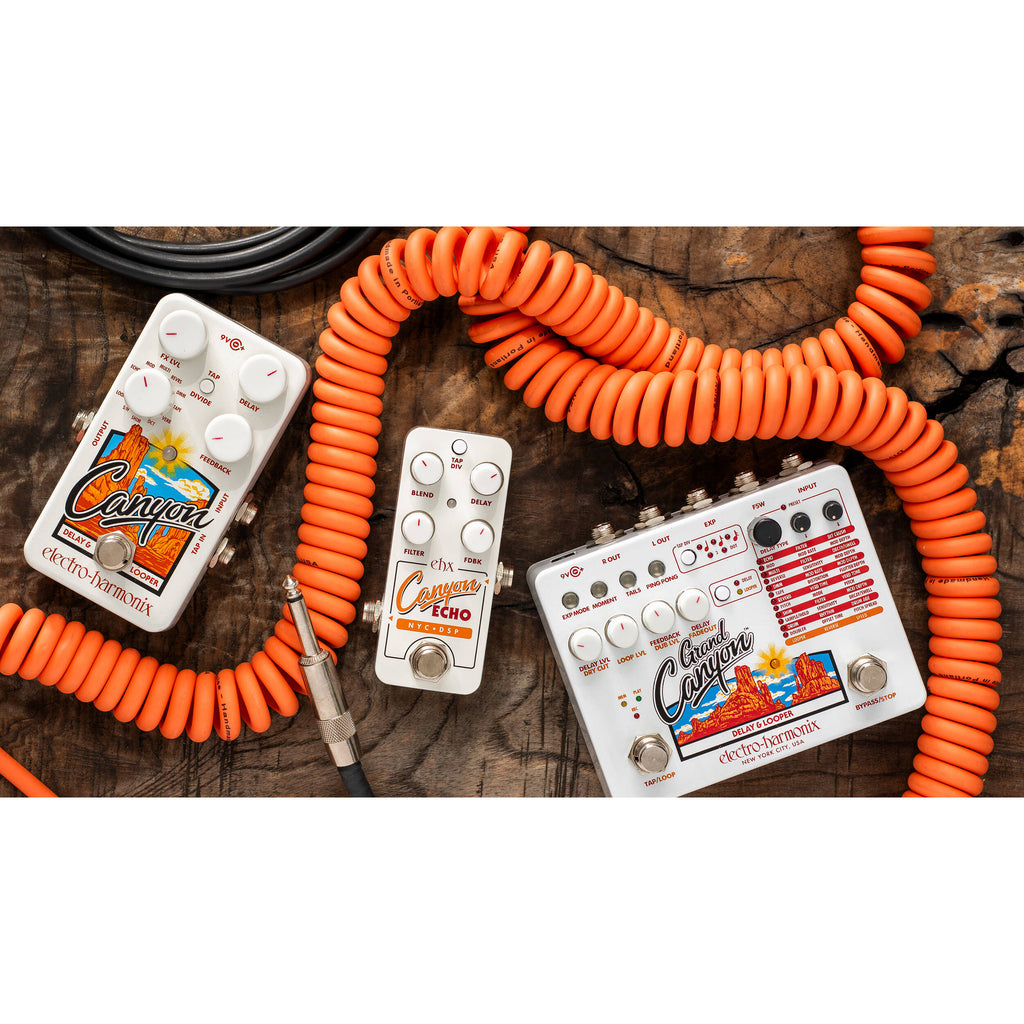 The Electro-Harmonix Canyon Echo harvests the digital delay algorithm from the company's full-sized Canyon Delay & Looper pedal and packs it into a compact, pico-sized housing. This feature-rich stompbox gives you crystal-clear delay effects — up to three seconds worth — with low- and high-frequency filtering, tap tempo with three division modes, and feedback values ranging from one to infinite repeats. You also get selectable tails bypass, which enables your repeats to continue after you switch off the pedal. The EXH Canyon Echo is a deceptively simple digital delay pedal, yet it's deep enough to tackle any time-bending undertaking you send its way.