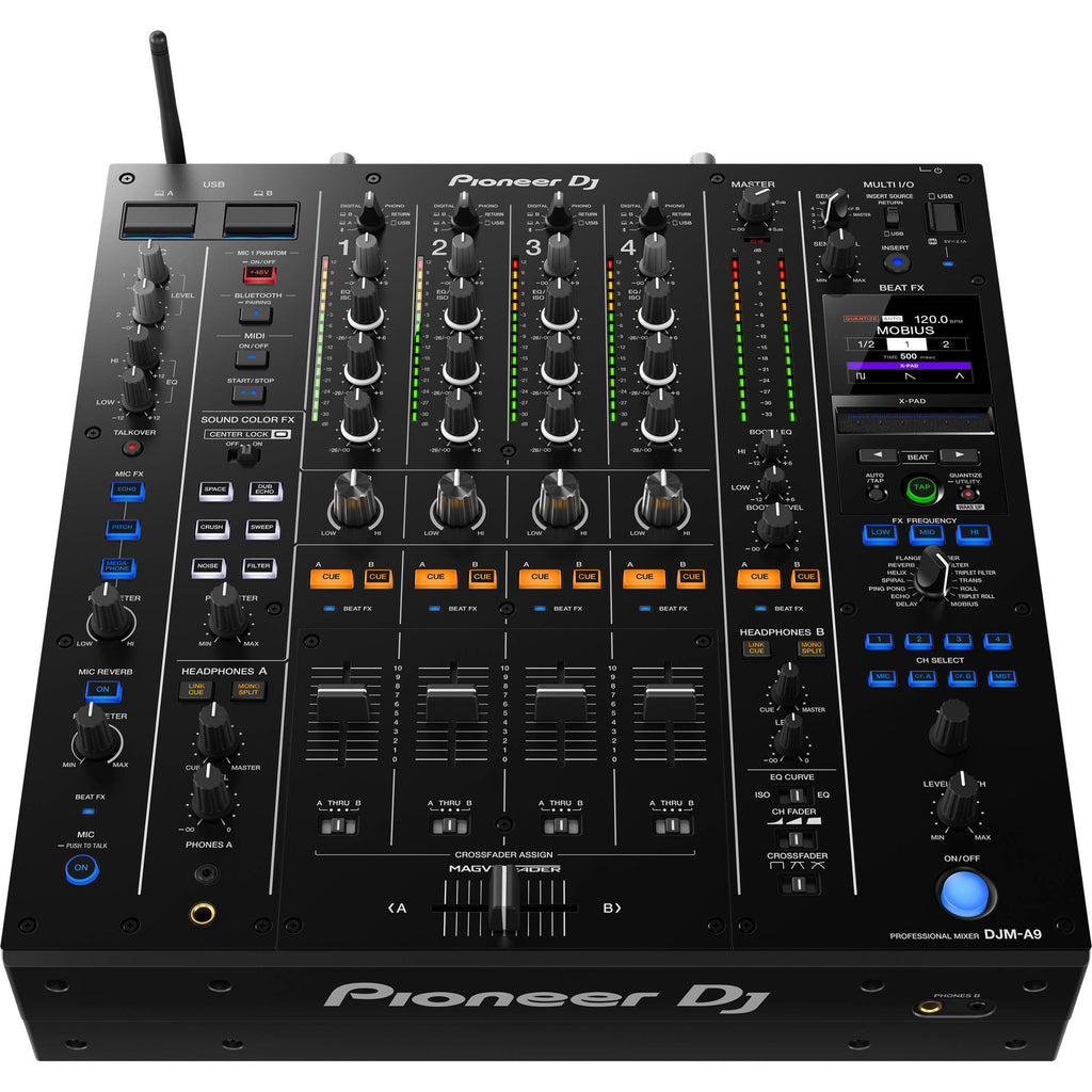 It would be a criminal understatement to merely call this a diverse mixer. Its comprehensive suite of connectivity options allows for unparalleled control and dynamism in your performances — solo or back-to-back. Two sets of USB-B and USB-C ports let you simultaneously connect two separate devices, regardless of their respective operating systems. An included antenna makes Wi-Fi or Bluetooth connections a breeze. Each channel can toggle its inputs, including Bluetooth, digital coaxial, line, phono, return, and three different USB choices. To ensure premium sound quality, the DJM-A9 is engineered with ESS Technologies’ 32-bit A/D converter, with the master and booth outputs each utilizing a high-fidelity, 32-bit D/A converter.