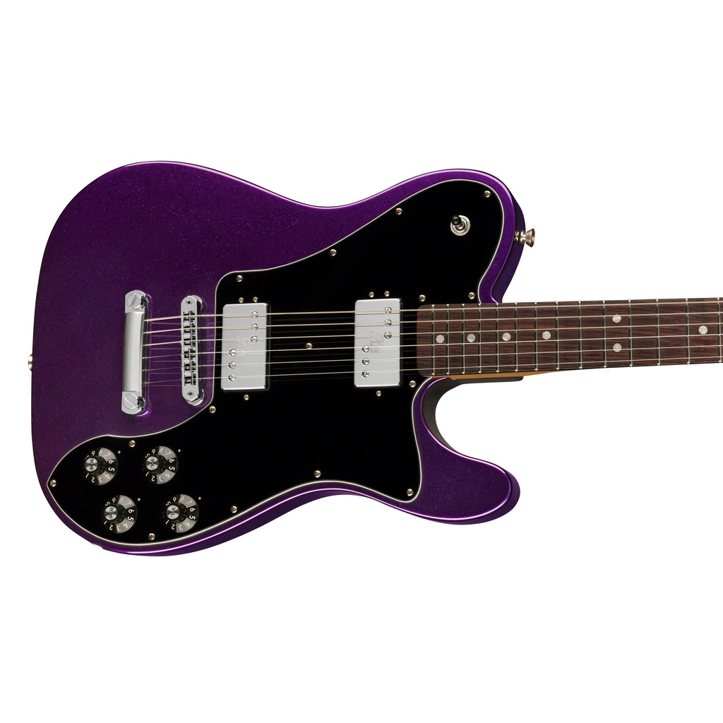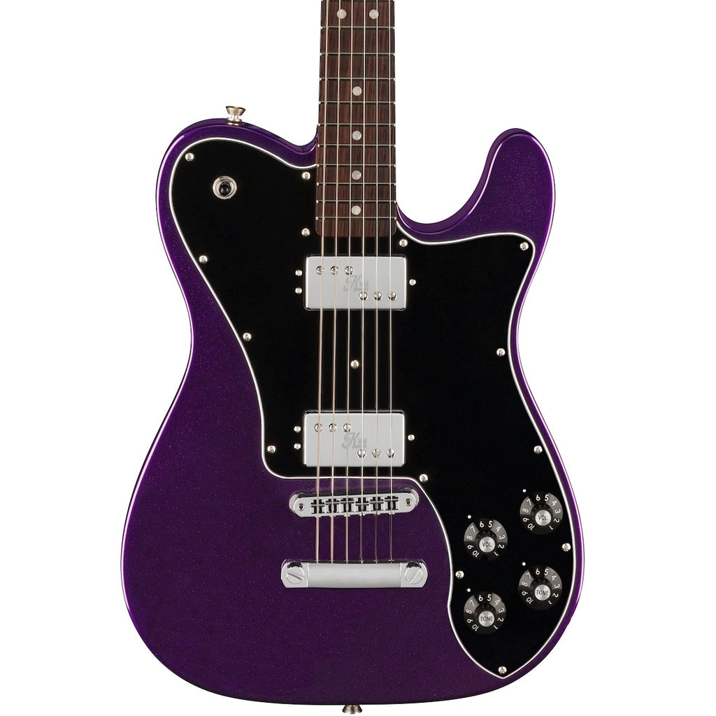 Recognized at a young age for his exceptional musical talent, Christone “Kingfish” Ingram’s path has taken him from hometown hero to global star. Christone’s raw and inspired guitar playing, soulful vocals and mature songwriting have captured the imagination of legions of new fans and fellow musicians alike, propelling him to become the face of a new generation of blues artists. The Kingfish Telecaster® Deluxe features two custom humbucking pickups voiced for growling, overdriven blues-rock and an adjusto-matic bridge for perfect intonation. The “V”-shaped roasted maple neck has a classic feel while the 12” radius slab rosewood fingerboard delivers chunky tones and big bends. The mesmerizing Mississippi Night finish has a shimmering purple glow that recalls a dark winter sky in Clarksdale. Other special features include Kingfish’s signature on the headstock, a custom neck plate and a “K” crown logo on the pickup covers. With guts and sophistication, the Kingfish Telecaster Deluxe delivers scorching blues in a classy package.