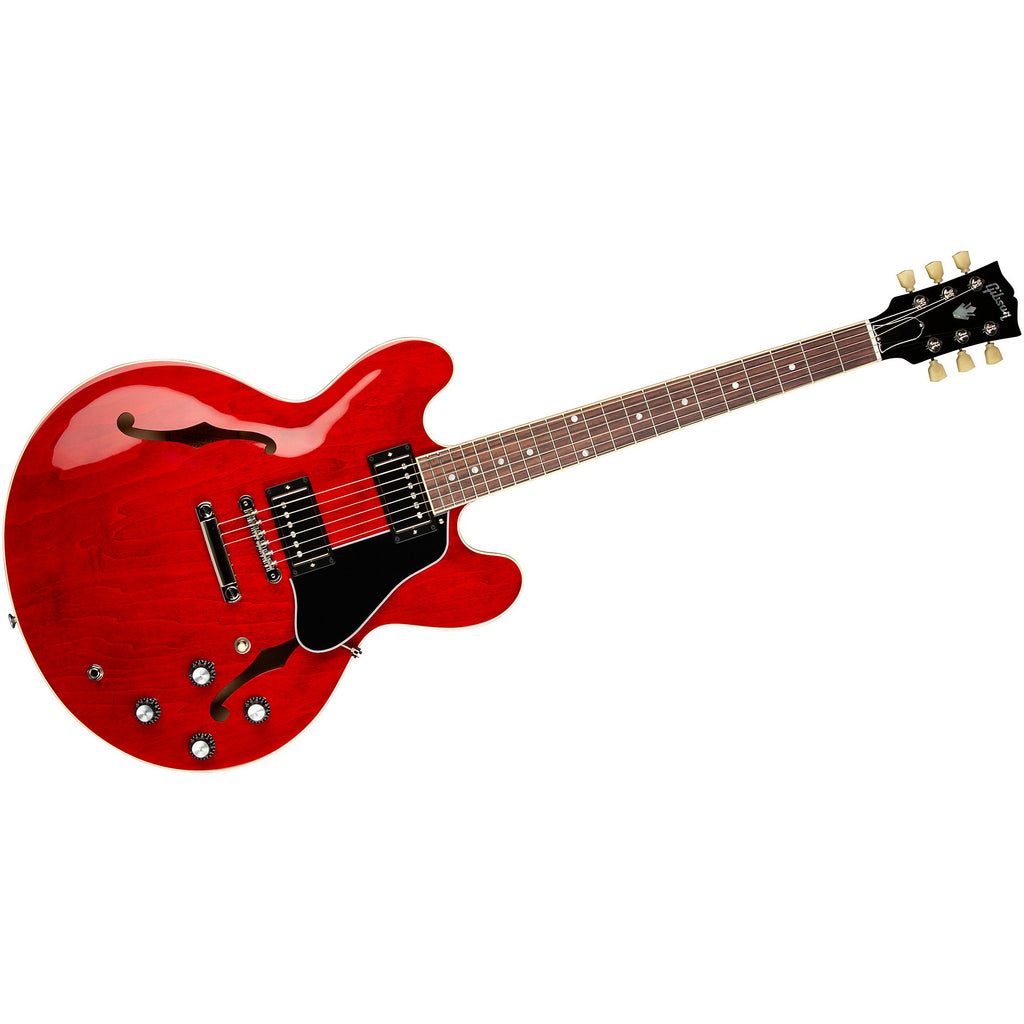 The Gibson ES-335 is the cornerstone of the Gibson ES™ line-up. From its inaugural appearance in 1958, the Gibson ES-335 set an unmatched standard. The acrylic dot inlay rosewood fingerboard on a Rounded "C" mahogany neck reminds players where it all started. Gibson's T-Type humbucking pickups are paired with our handwired control assembly. The result is that versatile Gibson ES tone that players have craved for over 60 years. Tuning stability and precise intonation are provided by the Vintage Deluxe tuners with Keystone buttons, paired with a lightweight Aluminum ABR-1 bridge and Stop Bar tailpiece, anchored by steel thumb-wheels and tailpiece studs.