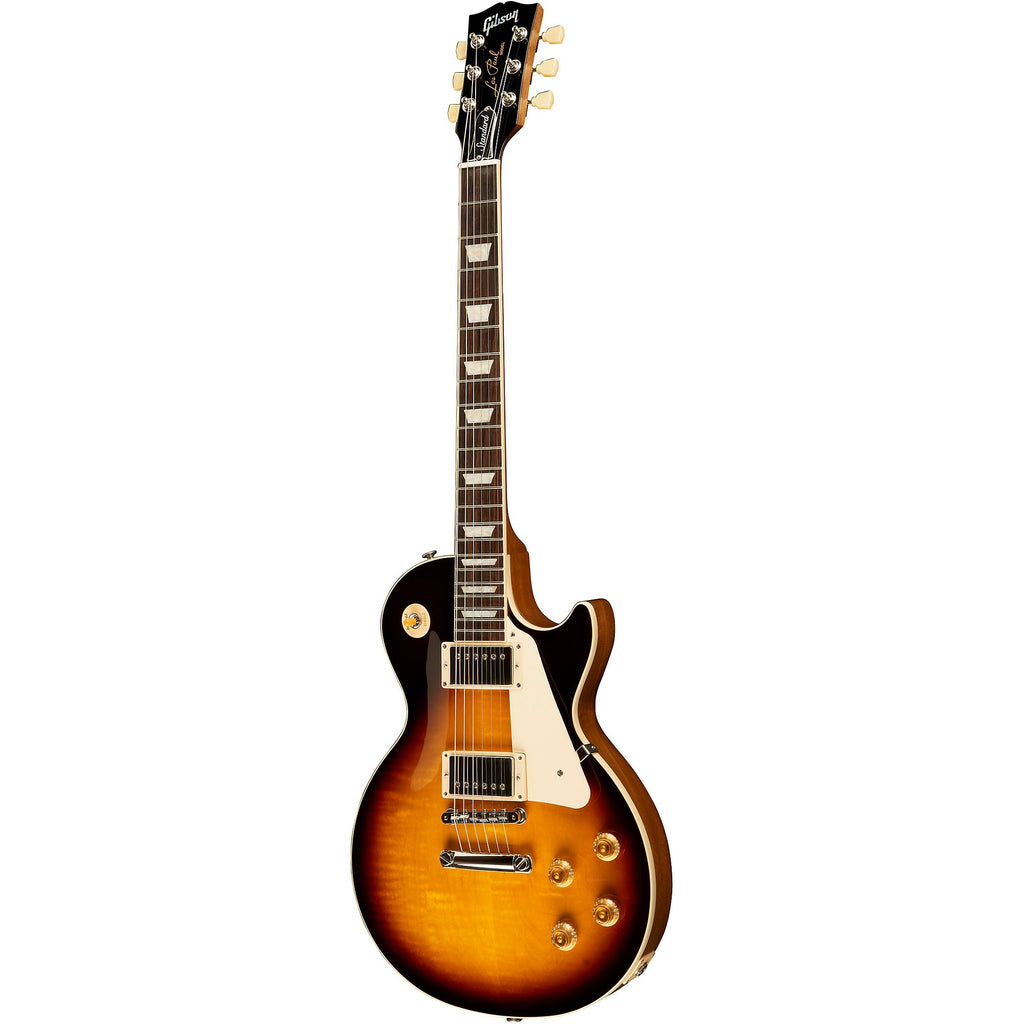 The new Les Paul™ Standard returns to the classic design that made it relevant, played, and loved – shaping sound across generations and genres of music. It pays tribute to Gibson's Golden Era of innovation and brings authenticity back to life. The Les Paul Standard '50s has a solid mahogany body with a maple top and a rounded 50s-style mahogany neck with a rosewood fingerboard and trapezoid inlays. It's equipped with an ABR-1, the classic-style Tune-O-Matic™ bridge, an aluminum Stop Bar tailpiece, Vintage Deluxe tuners with Keystone buttons, and aged gold Top Hat knobs. The calibrated Burstbucker™ 1 (neck) and Burstbucker 2 (bridge) pickups are loaded with Alnico 2 magnets and wired with audio taper potentiometers and Orange Drop® capacitors.