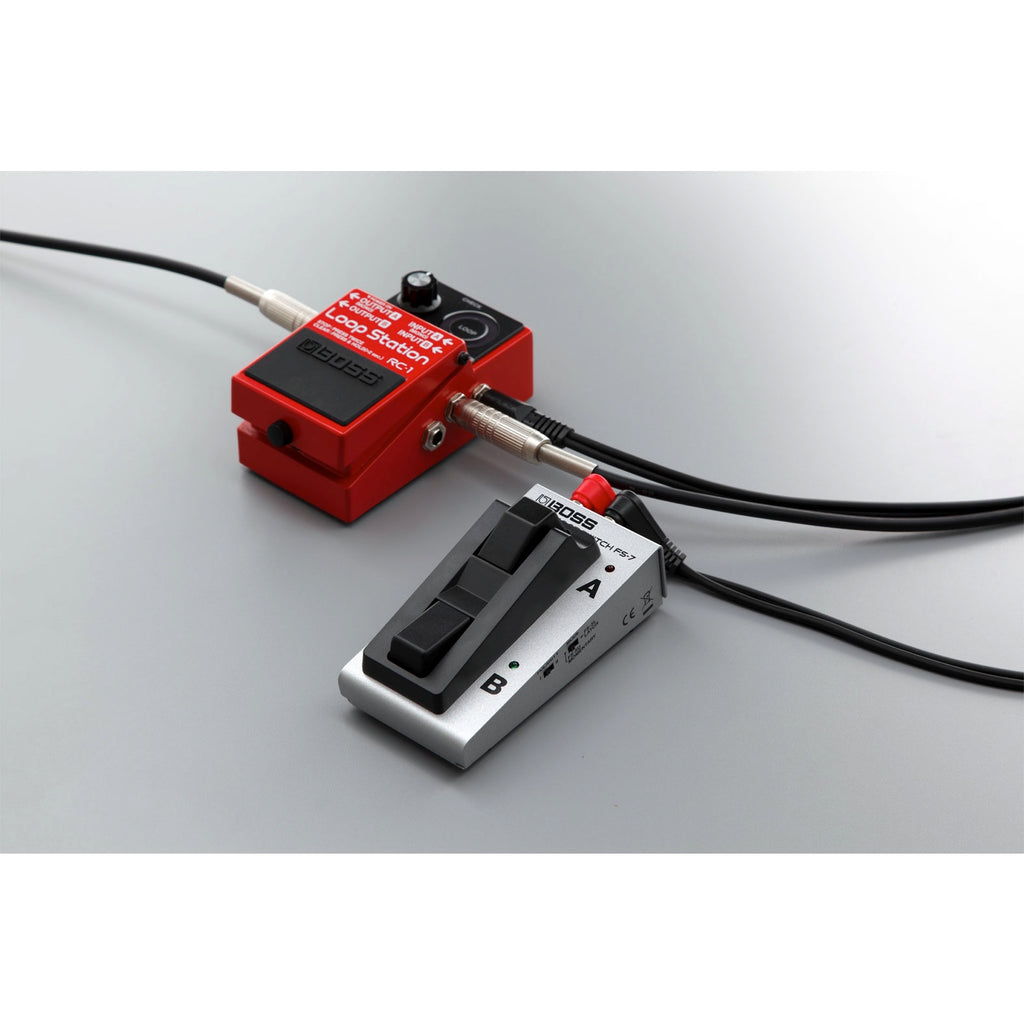 FS-7 is a compact dual footswitch for remote control of effect pedals or amp channel switching. Two footswitches are arranged in tandem, which saves space on effects pedal boards. Two selectable modes for latch or momentary allow for control of a wide range of equipment.
