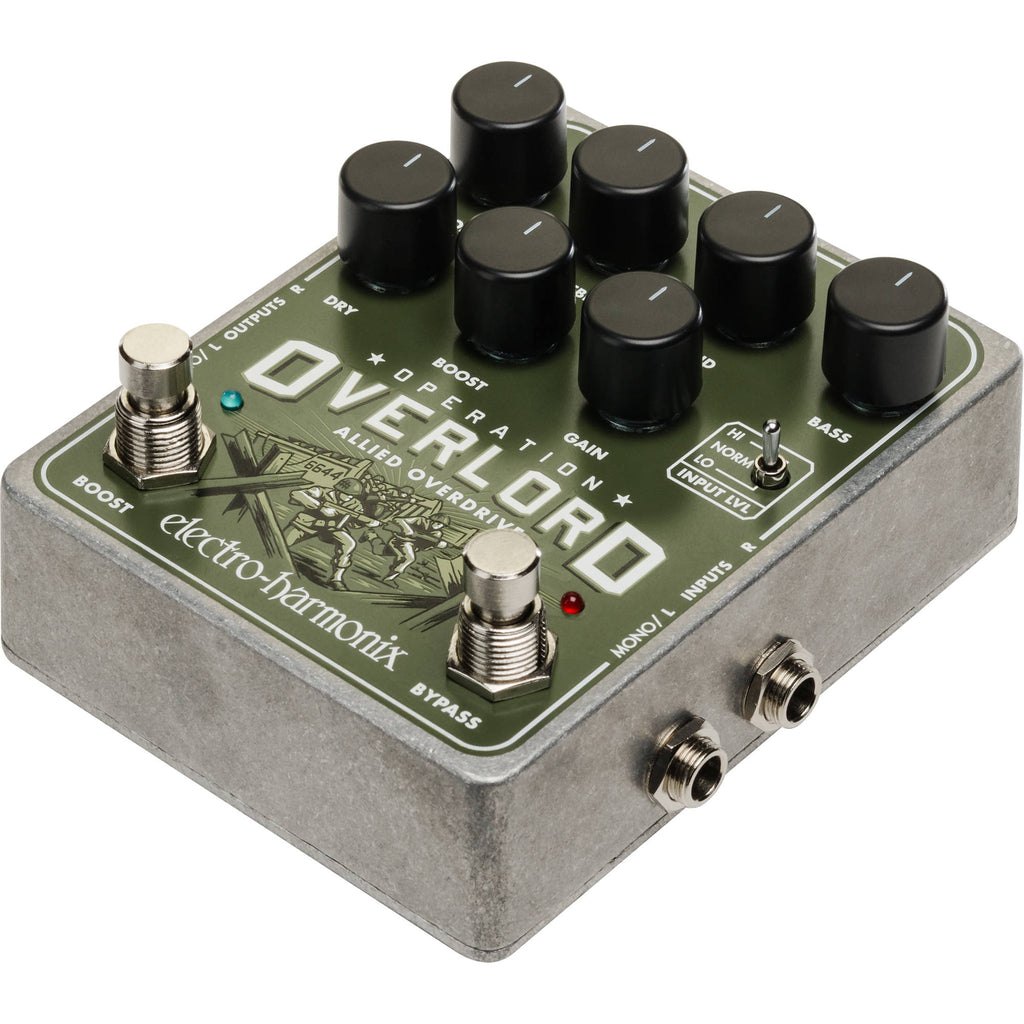 With the EHX Operation Overlord Allied Overdrive, whether you play guitar, bass, keyboards or pretty much any electronic instrument — dialing in great drive sounds is fast and foolproof. Active 3-band EQ controls, footswitchable BOOST mode, and a dry blend provide versatility for different tones and instruments. The OVERLORD also features two independent distortion channels for use with stereo setups. Whatever your rig, the Overlord is your indispensable ally.