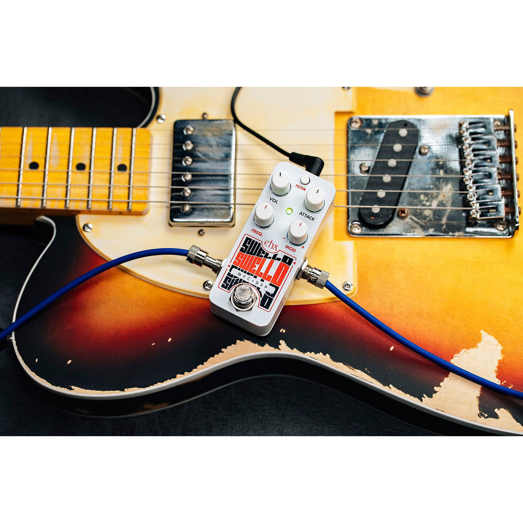 One of Electro-Harmonix’s most popular effects, there are many reasons to love the POG2. One major reason being its unique attack filter, applying attack envelopes to each individual note played whether in single notes or in a chord. This creates a very musical, multi-voice effect that’s extremely adaptive to any musical style. This polyphonic attack filter is the core of the PICO Swello generating polyphonic and reverse sounds with the addition of a modulated low-pass filter for even more expressive tones. Implemented subtly, the Swello adjusts your guitar’s attack to sound smooth and flowing even while playing fast lines and arpeggios. Laying on the effect more heavily creates dramatic swells perfect for shaping gently shifting ambient soundscapes and synth style pads. The simple 4-knob control layout is easy to drive starting with the heart of the pedal, the ATTACK knob. Turn up ATTACK to go from a quick, gentle attack time to slow, long swells. VOL controls the overall output and is useful for making up for the perceived low volume of long attack effects. The rest of the controls apply to the Low-Pass Filter. The Filter Button engages the LPF with adjustable low and high resonance settings. The FREQ control adjusts the cutoff frequency of the LPF. The MOD knob controls the depth and direction of the LPF envelope for upward or downward filter sweeps over a narrow or wide range of frequencies limited by the cutoff frequency. The LPF’s modulation timing is tied directly to the ATTACK knob setting. Combining the LPF with the Attack Envelope brings added musicality and expressiveness to fan-favorite effect, now in its very own pedal.