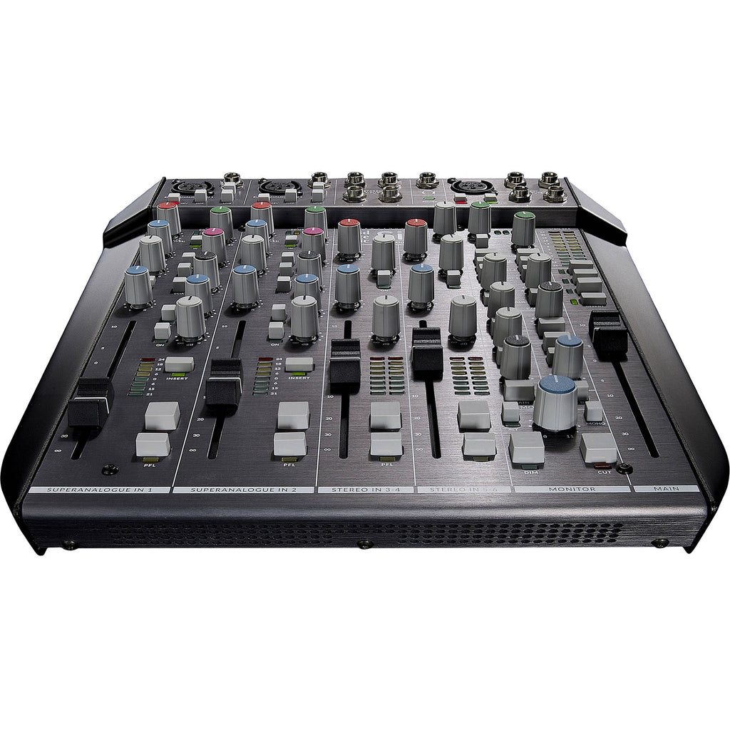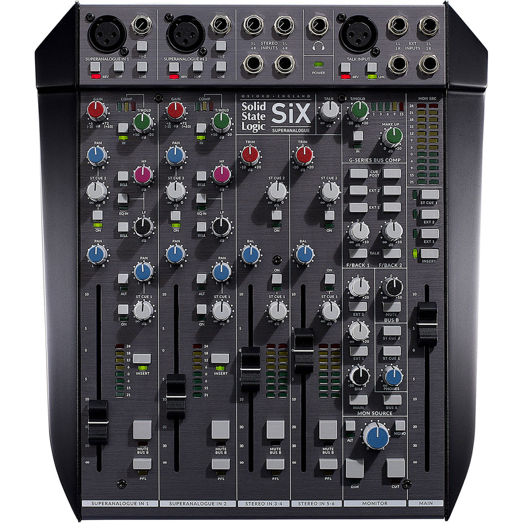 SiX is a condensed professional console for use in the studio, in post-production, on stage, and for podcasting. SiX offers big console sound and an impressive set of utility features in a format that is small enough to stick in a bag a go wherever you need it. SiX is stunning value; it offers two recording channels with SuperAnalogueTM mic pres, two band EQ, an essential one knob version of the classic SSL Channel Compressor, a new two-band Channel EQ, inserts and 100mm faders. There is a two-knob version of the legendary G-Series Bus Compressor on the main mix bus and the unique Listen Mic Compressor on the Talkback. In mixdown mode it is a very capable twelve channel summing system that offers analogue detail, depth and width to your mixes.