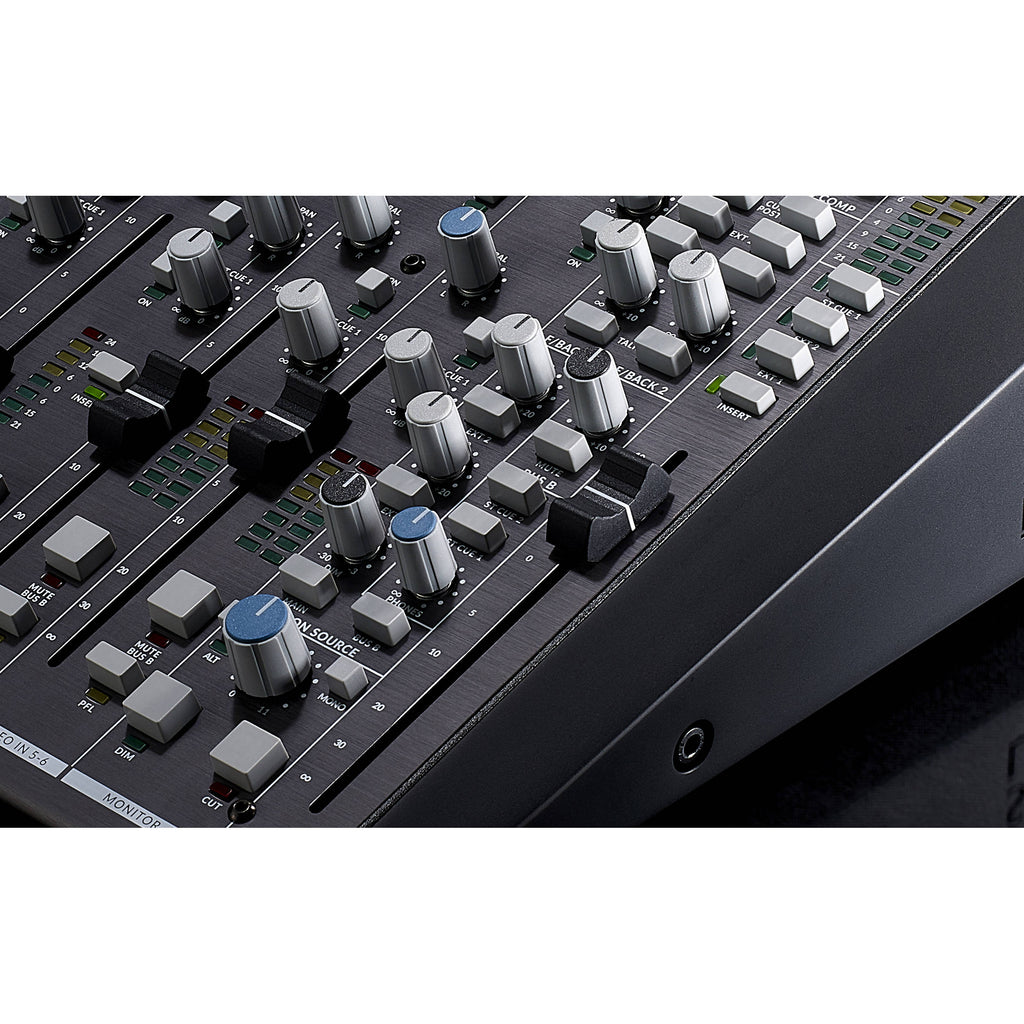 A new 2-band SSL equalizer design also makes its debut on channels 1 and 2, switchable between shelf and bell curves, with unique center frequencies for each type. There is also a balanced insert point for integration with outboard signal processing, and in the SSL tradition, the insert send is always active, so it can be used as a record send to your DAW. SiX features full-size 100mm faders with tapers that give you maximum control over the most usable gain range for both studio and live sound applications.