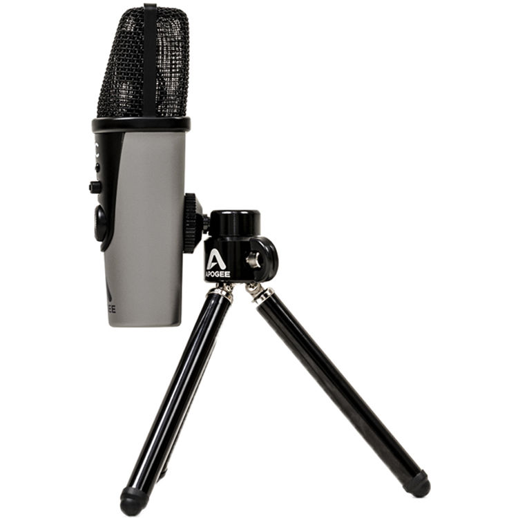 The Apogee MiC Plus ensures full, clean recordings with support for up to 24-bit/96kHz resolution. Front-panel controls allow easy adjustment of input level and monitor blending, while a built-in threaded camera mount adds mounting flexibility. The headphone output and USB connection are neatly positioned on the bottom of the microphone to keep cables out of the way. Included accessories such as a mini tripod, mic stand adapter, and multiple USB and Lightning cables make the MiC Plus ready for recording right out of the box.