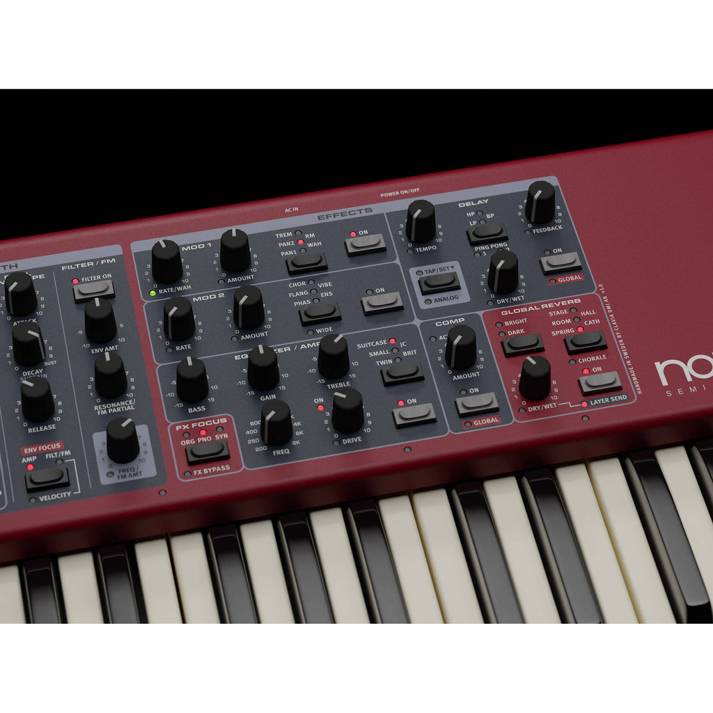 Nord loaded the Electro 7 with tons of features that make gigging and recording easier than ever. A new large color display lets you instantly see your settings, effects, and more. You can also set up splits and layers that combine the organ, piano, and sample sections. The updated Synth section gives you expanded controls for sample playback, Analog and FM synthesis, Mono and Legato modes, Glide and Unison, a Filter with resonance and FM partials, an ADR Envelope for amp and filter, and synth Vibrato. The Piano section now offers Dynamic Compression and Unison modes. The Effects section has also been updated with controls for Ring Modulator, Rate/Amount, and Vibe, as well as a Compressor selectable either globally or per section, a global Reverb with per layer Send, and new amps, including spectacular Suitcase and Brit models.